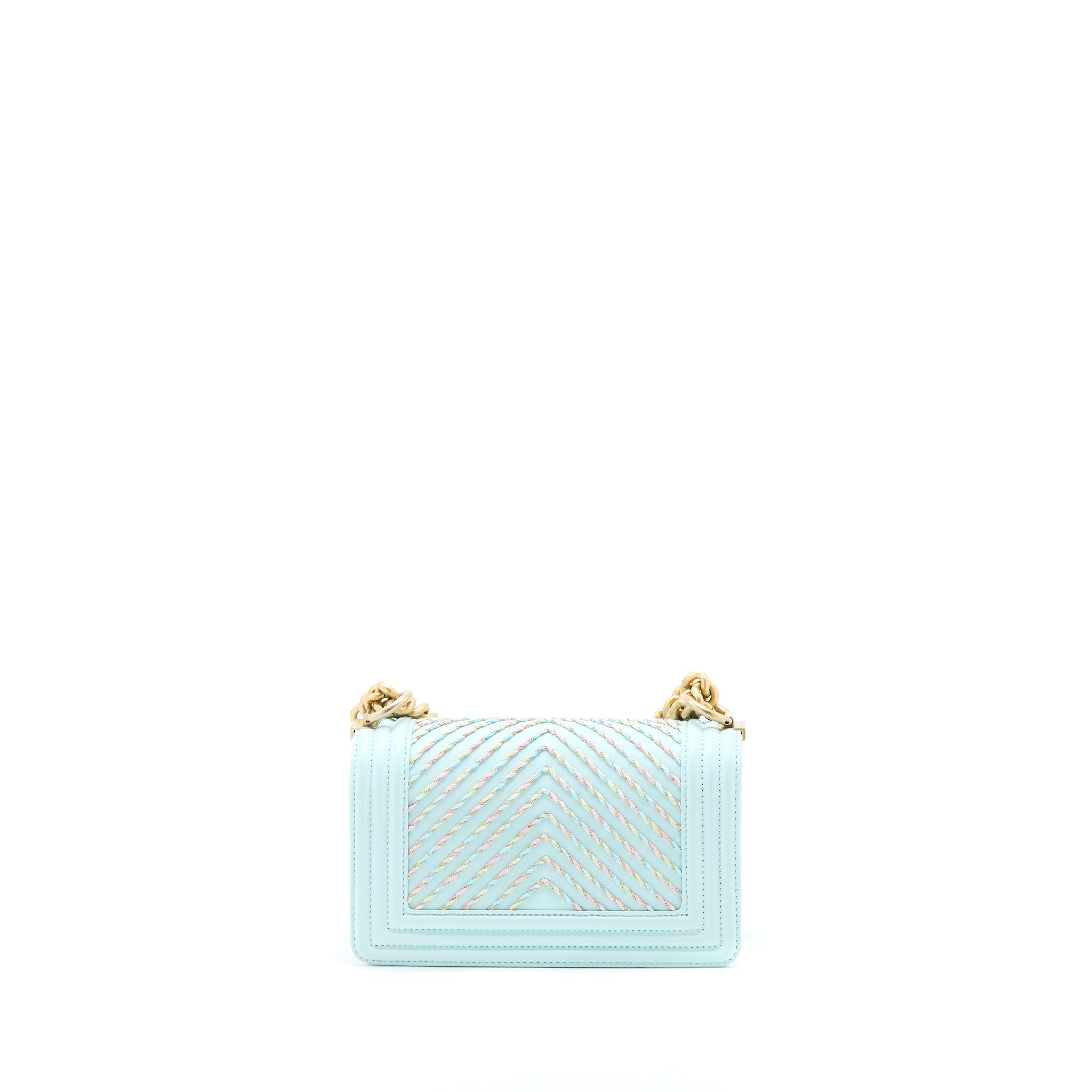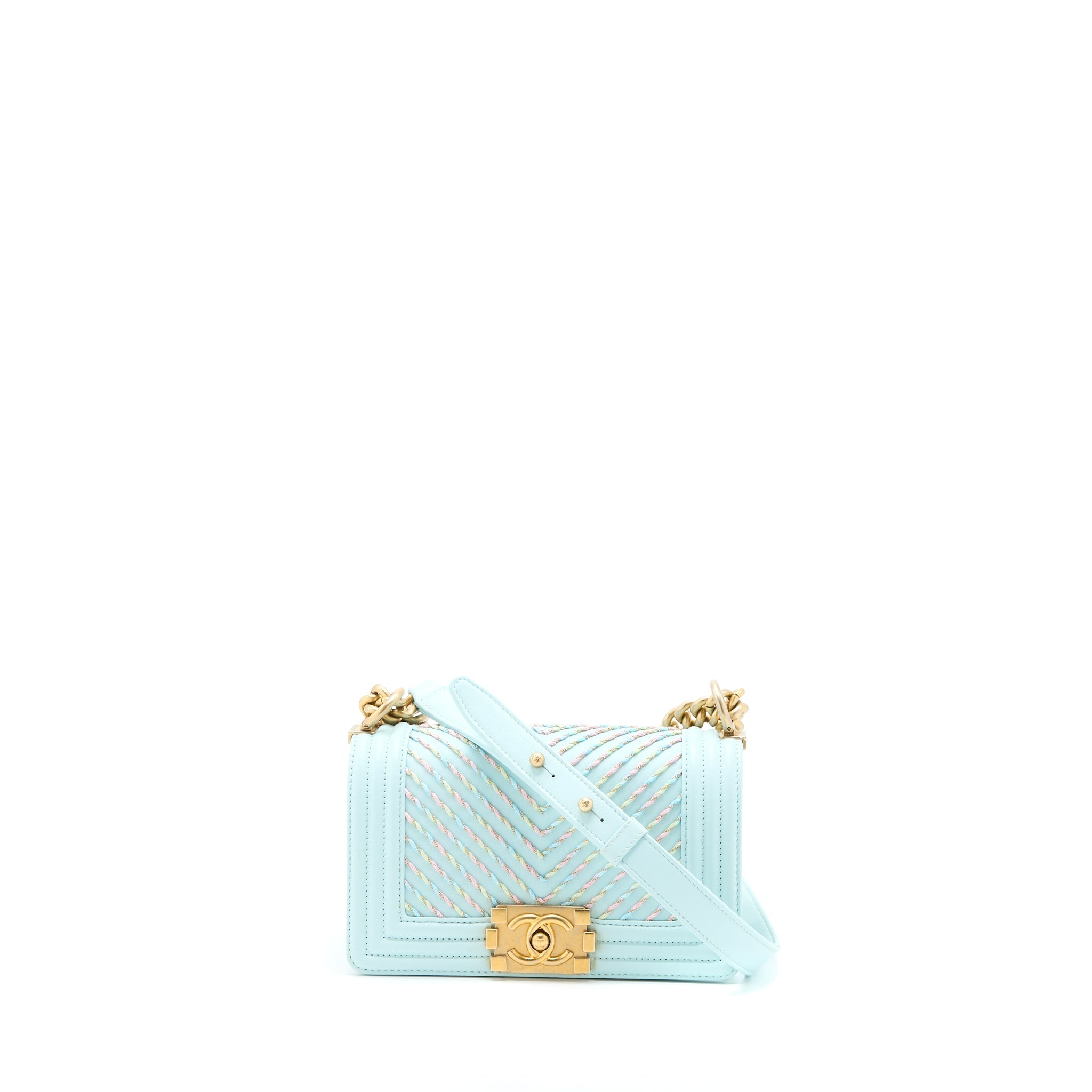 CHANEL SMALL BOY BAG CHEVRON CALFSKIN LIGHT BLUE/MULTICOLOUR BRUSHED GHW