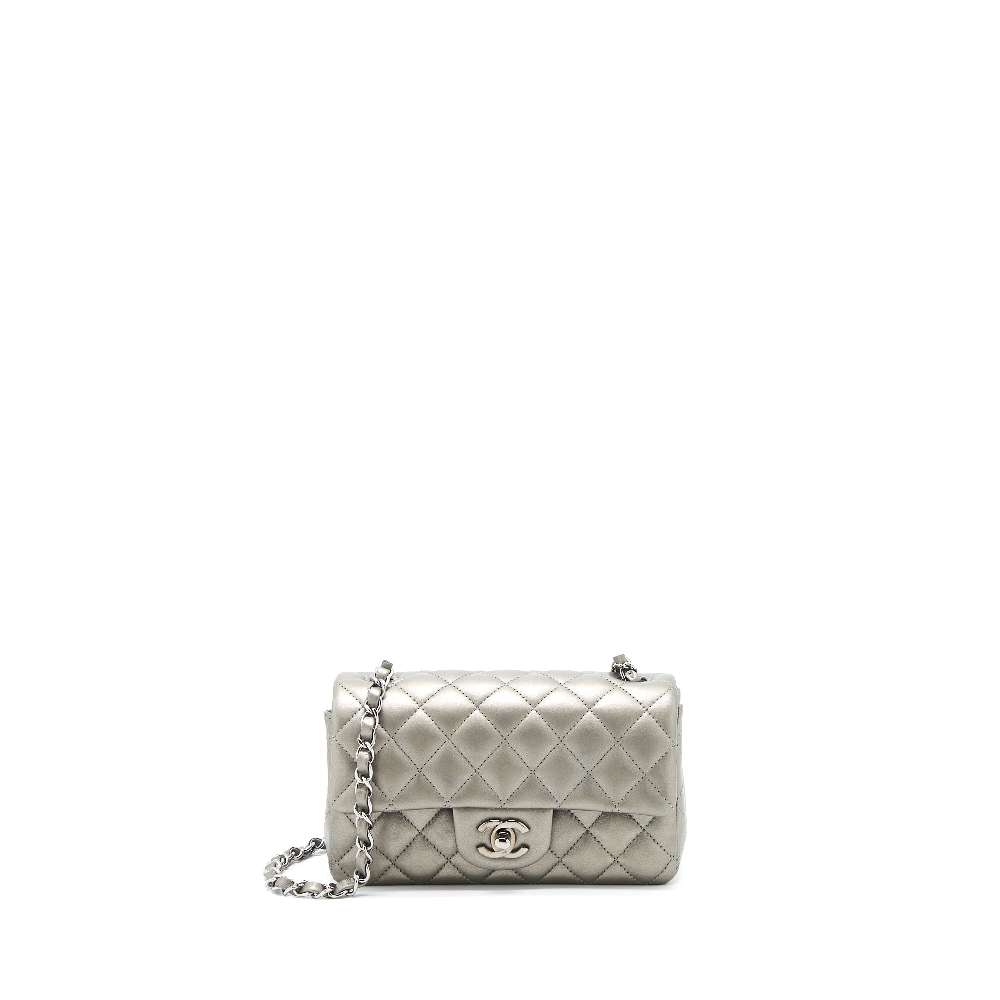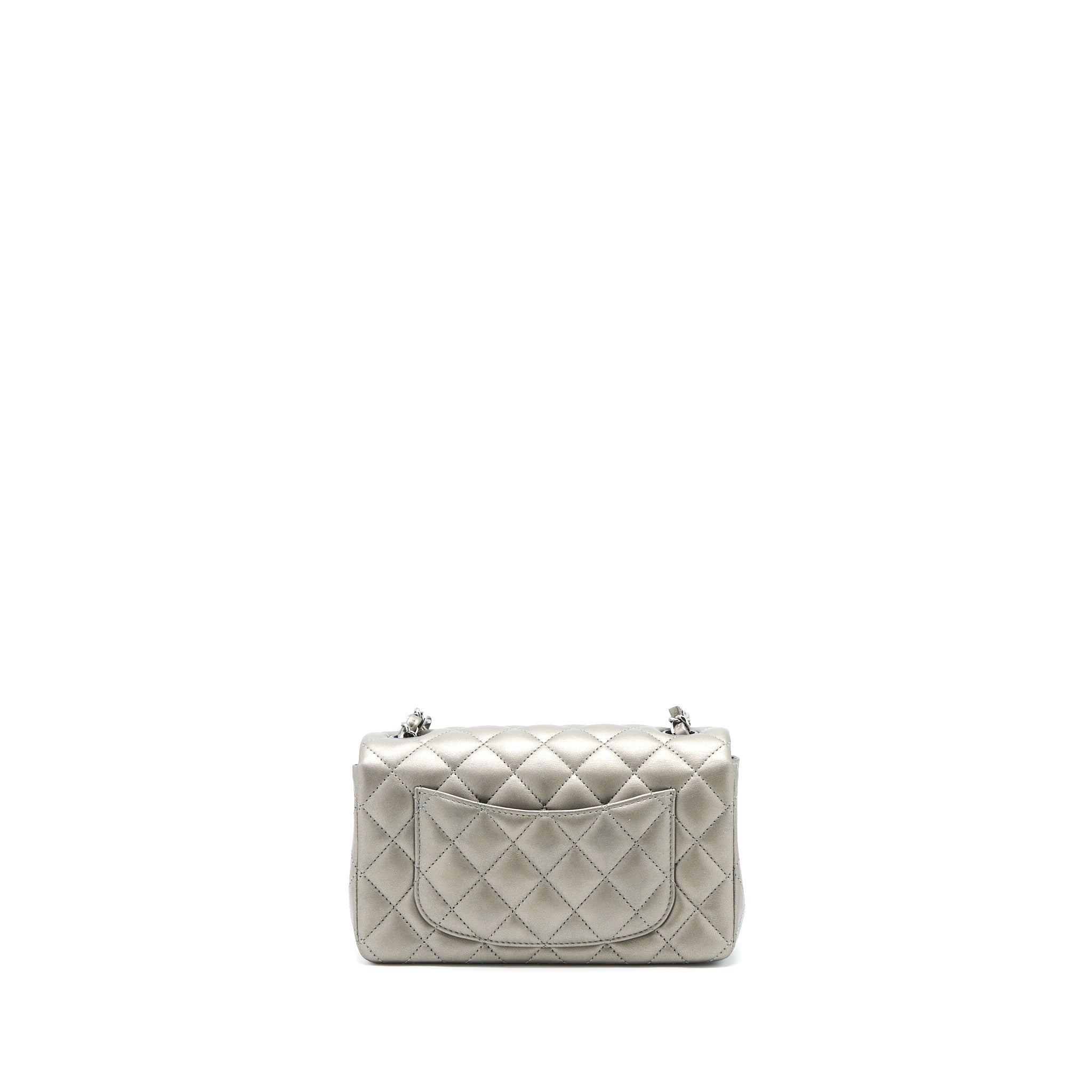 CHANEL 21B MINI RECTANGULAR FLAP BAG CALFSKIN METALLIC SILVER WITH SHINY RUTHENIUM HARDWARE (MICROCHIP)