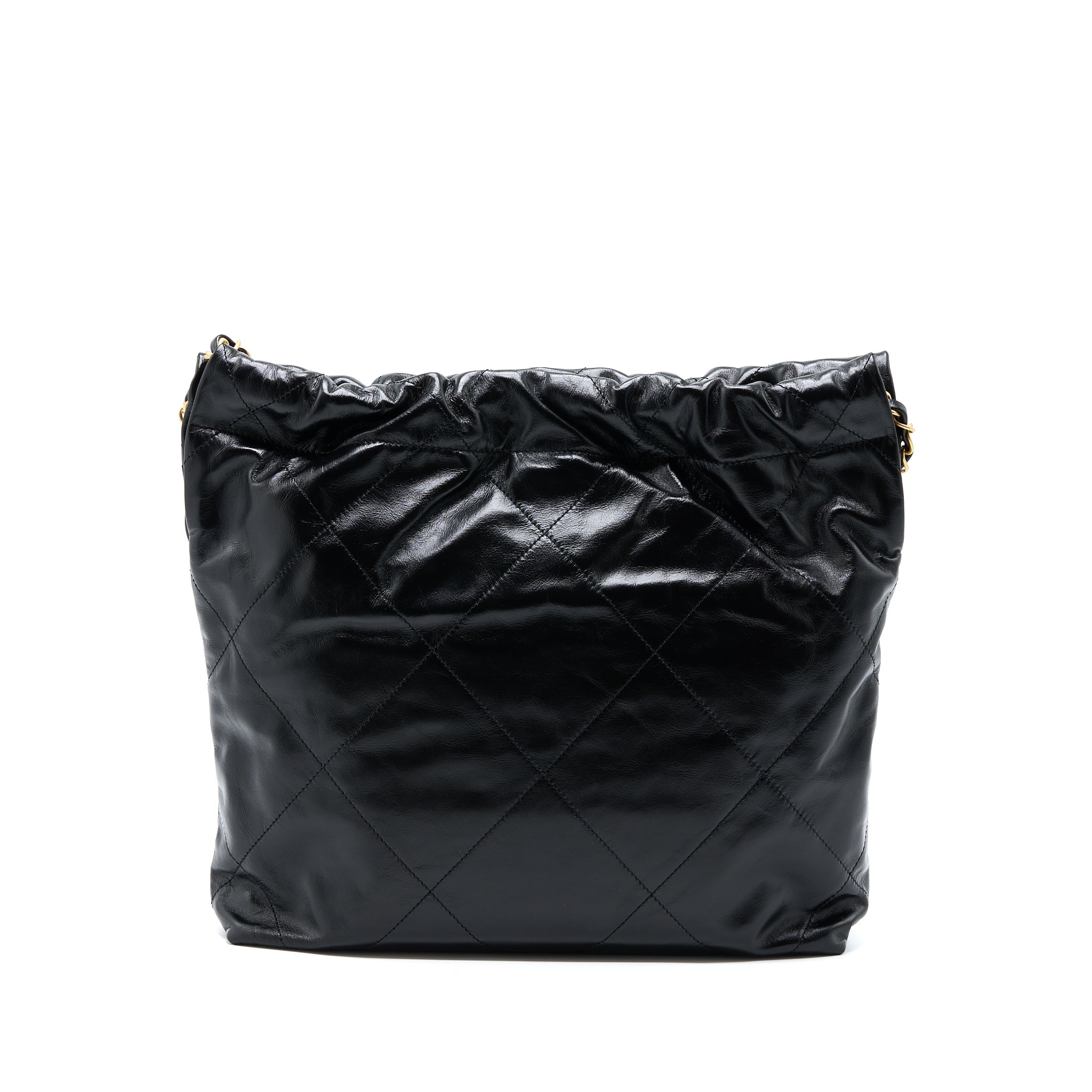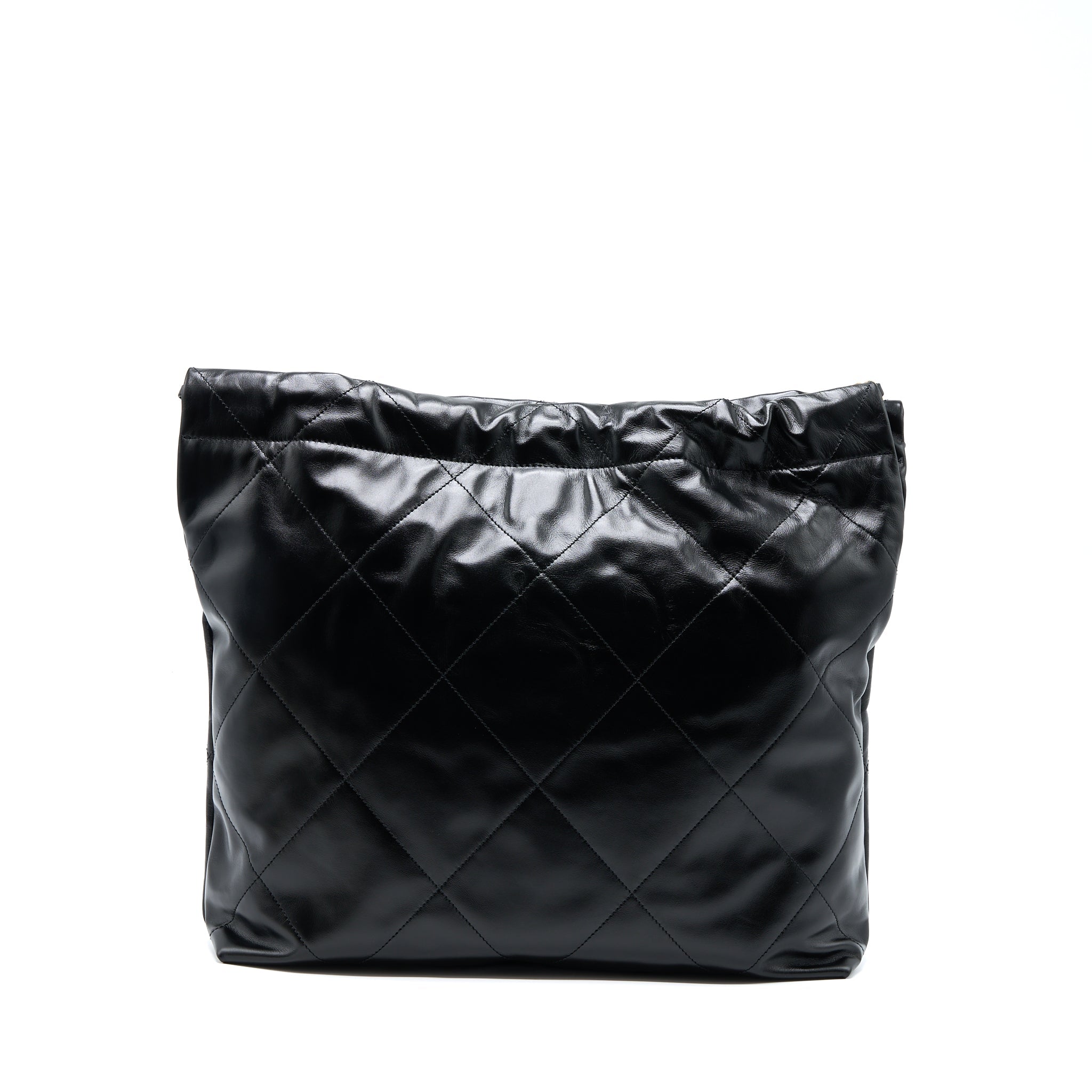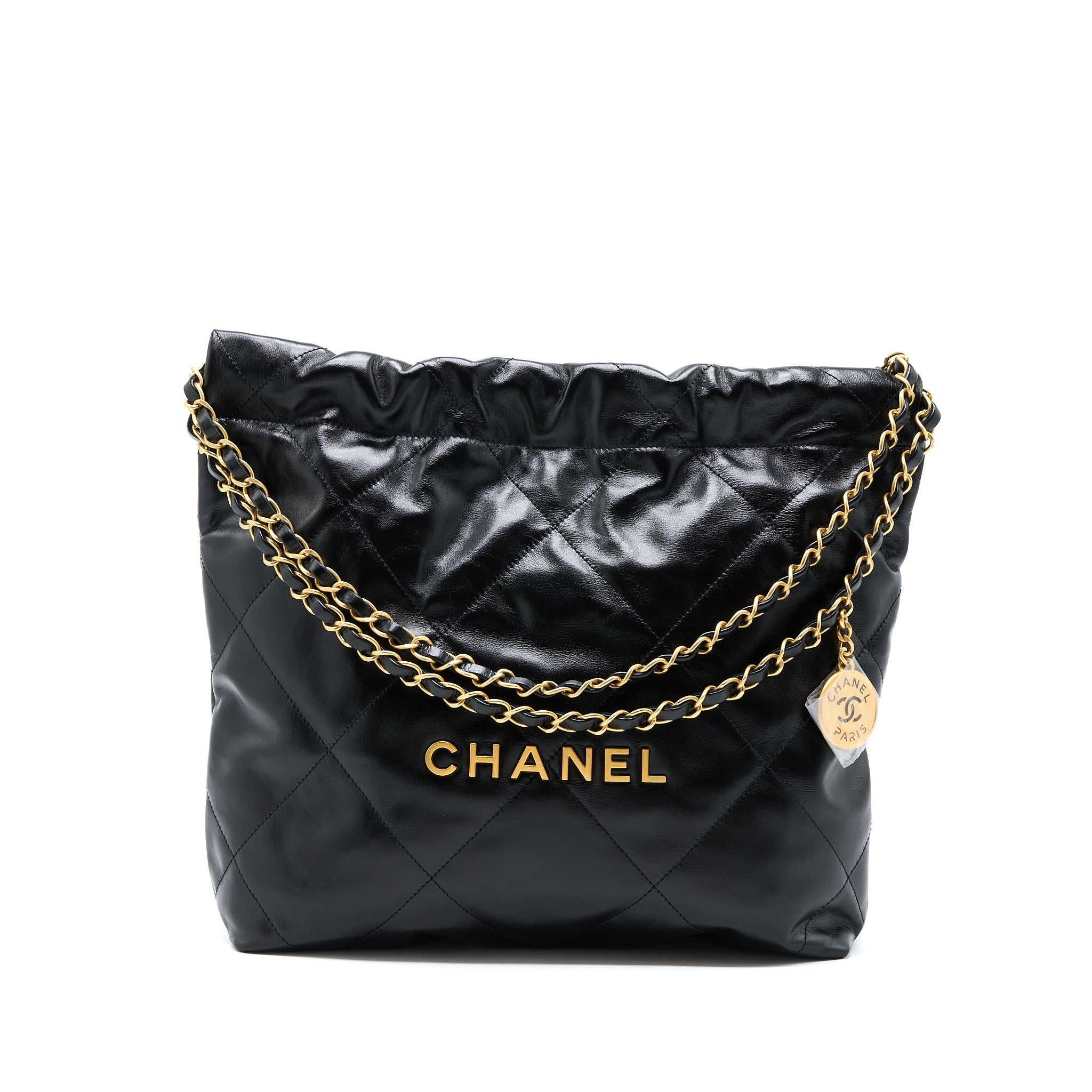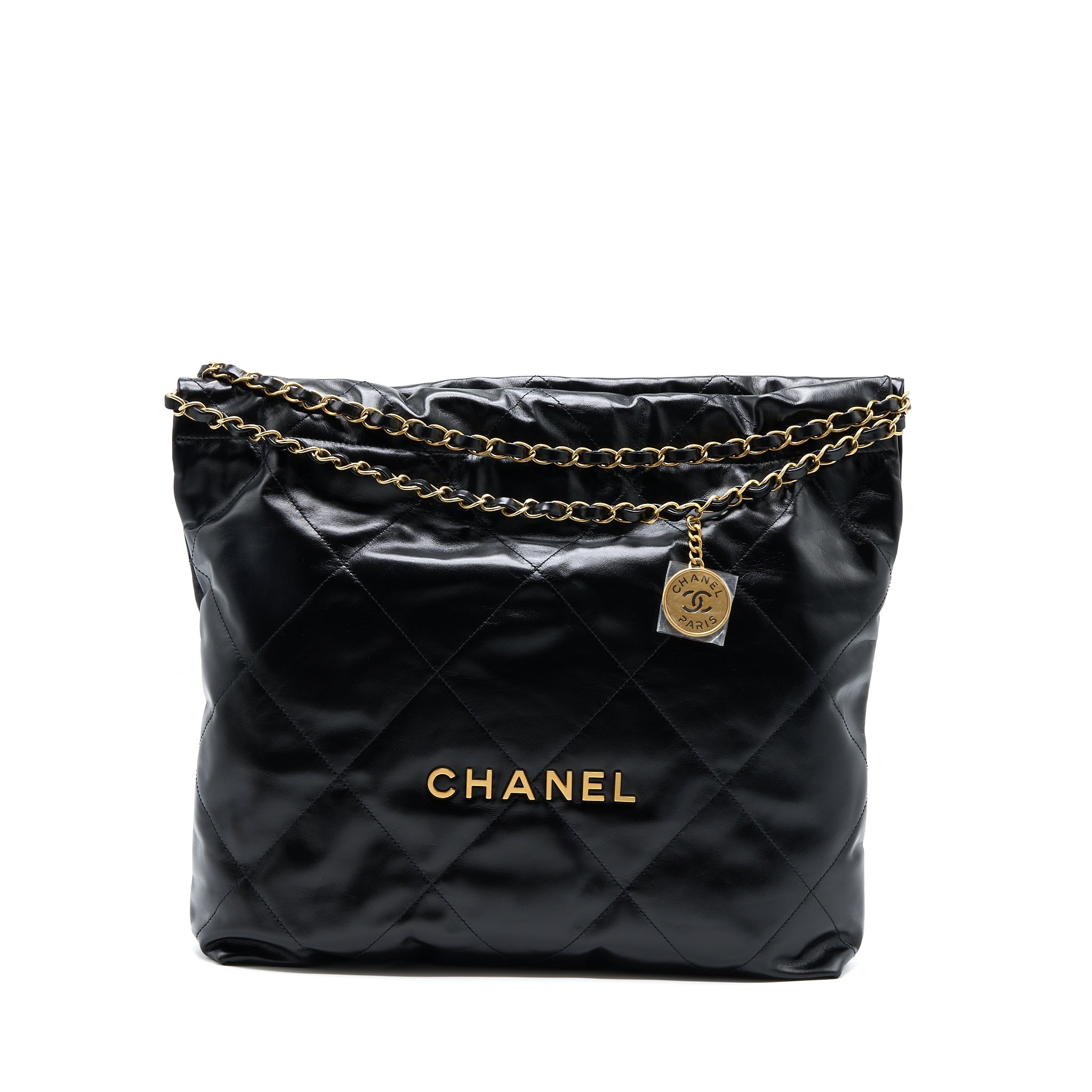 CHANEL MEDIUM 22 BAG GOLD LETTER SHINY CALFSKIN BLACK GHW (MICROCHIP)