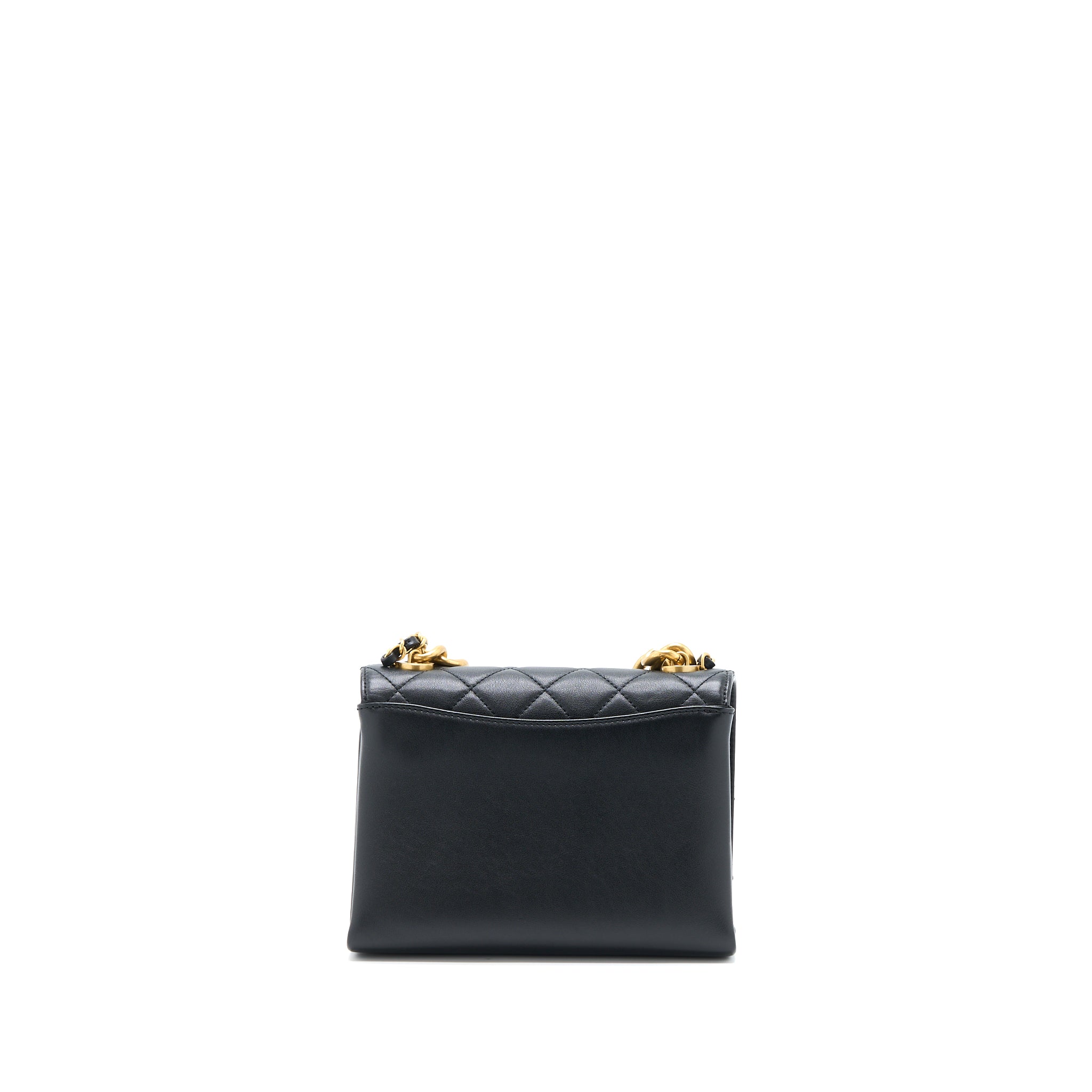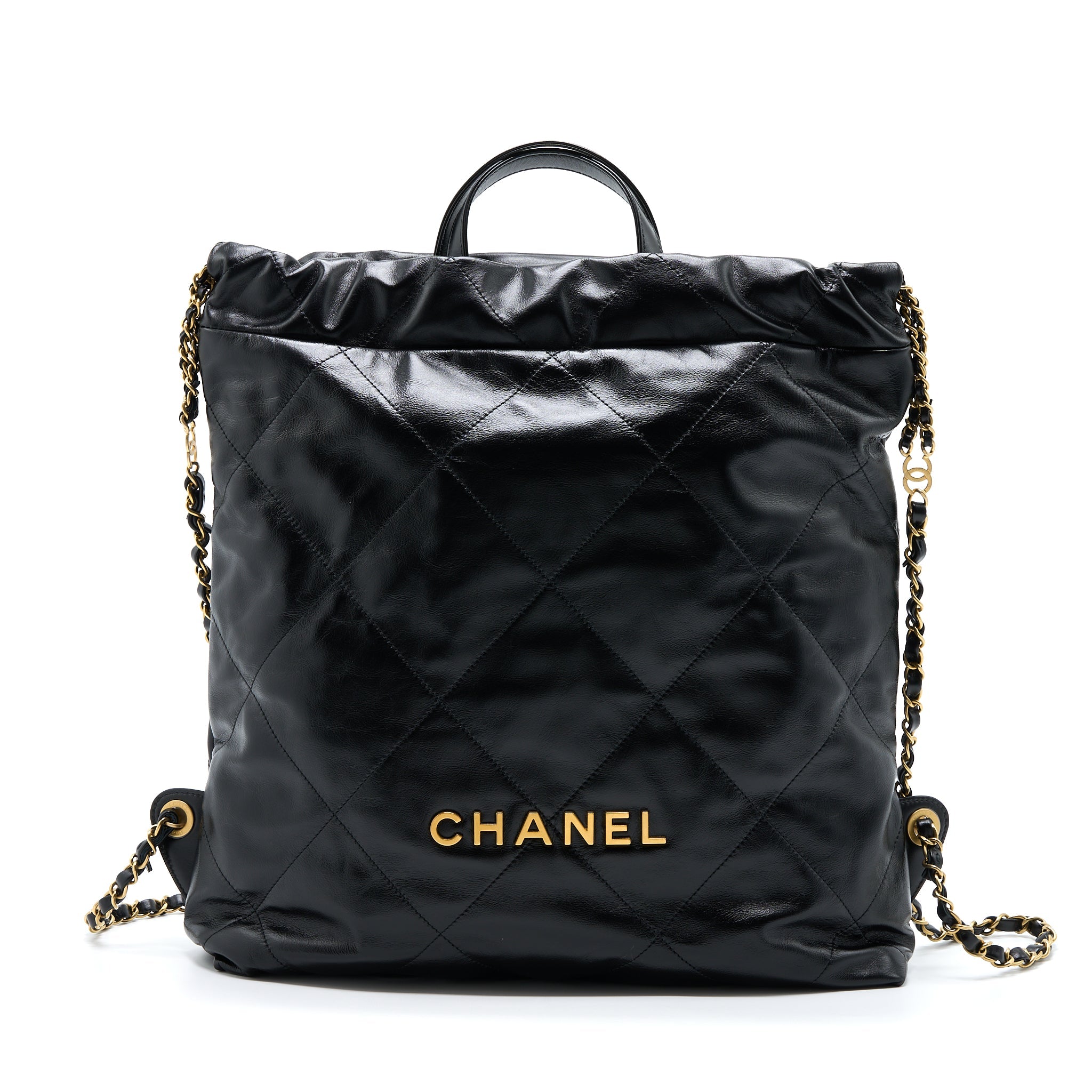 CHANEL SMALL 22 BAG GOLD LETTER SHINY CALFSKIN BLACK GHW (MICROCHIP)