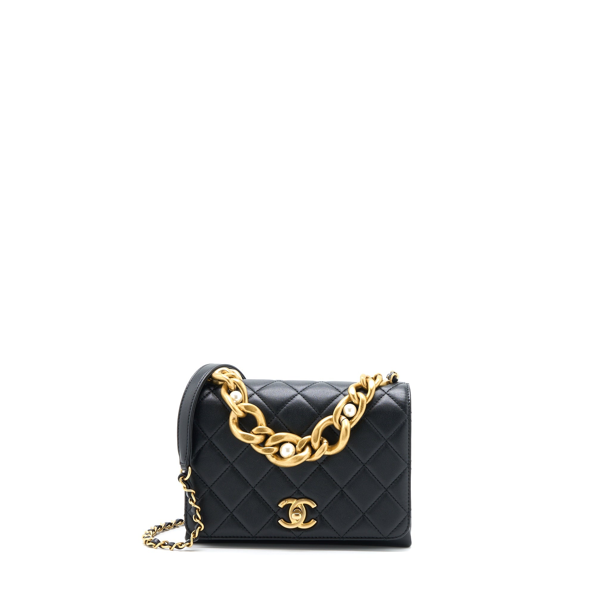CHANEL SEASONAL FLAP BAG GIANT CHAIN HANDLE WITH PEARL CALFSKIN BLACK BRUSH GHW (MICROCHIP)