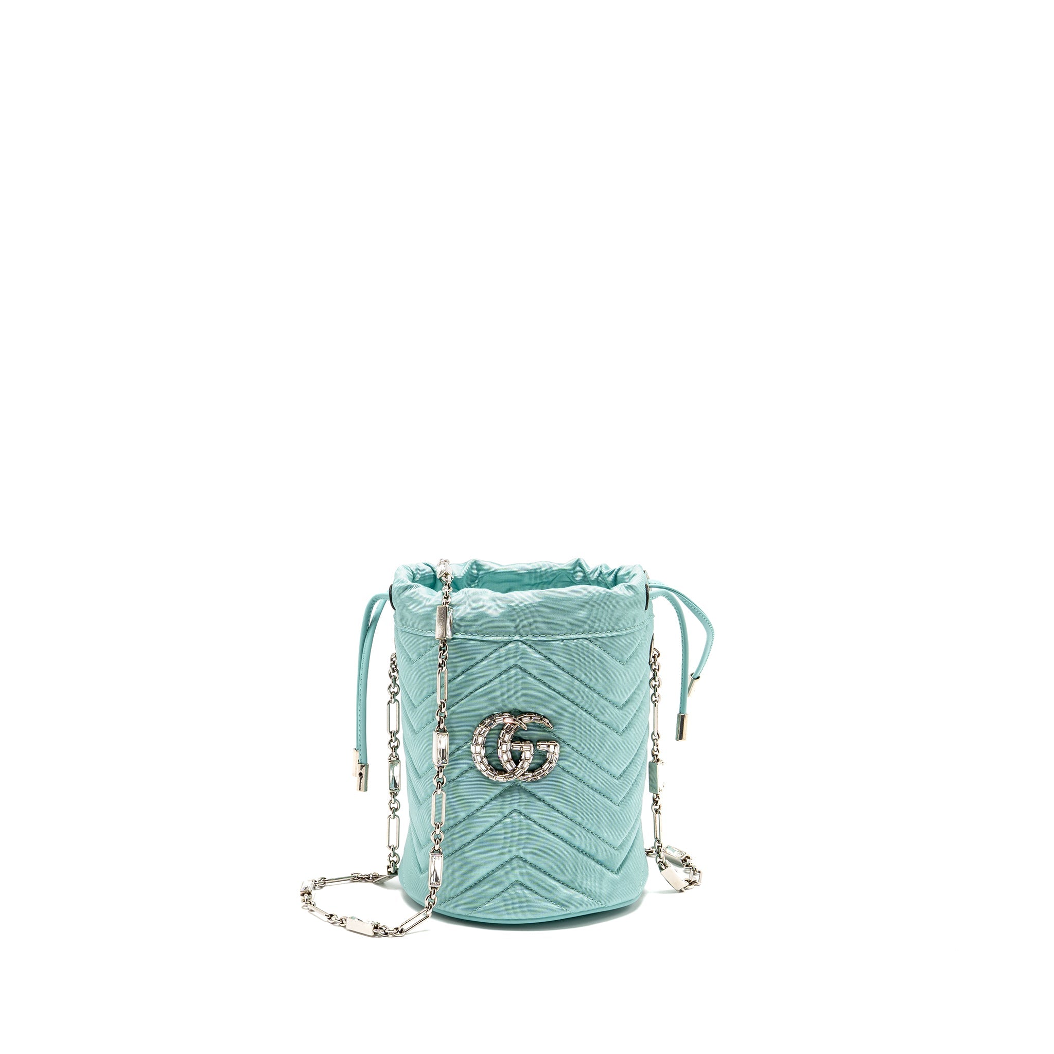 GUCCI GG MARMONT SILK BUCKET CRYSTAL CHAIN BAG FABRIC/ CRYSTAL LIGHT BLUE SHW