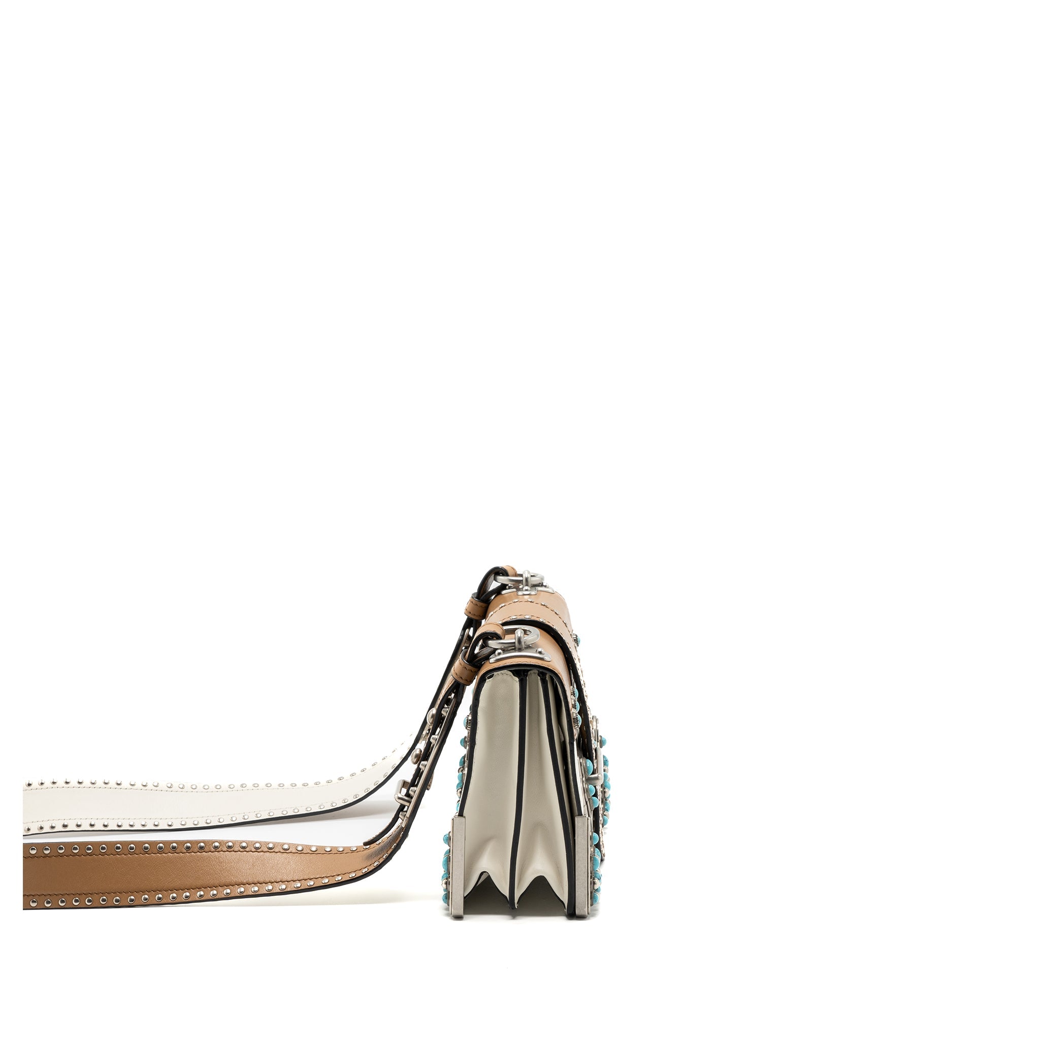 PRADA CAHIER EMBELLISHED TWO-TONE LEATHER SHOULDER BAG WHITE / CARAMEL SHW